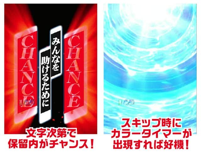 P-スキップ活用時は画面に注目。コミック画面で文字が出現すれば保留内がチャンス、カラータイマーが発生すれば直後の告知発生に期待!