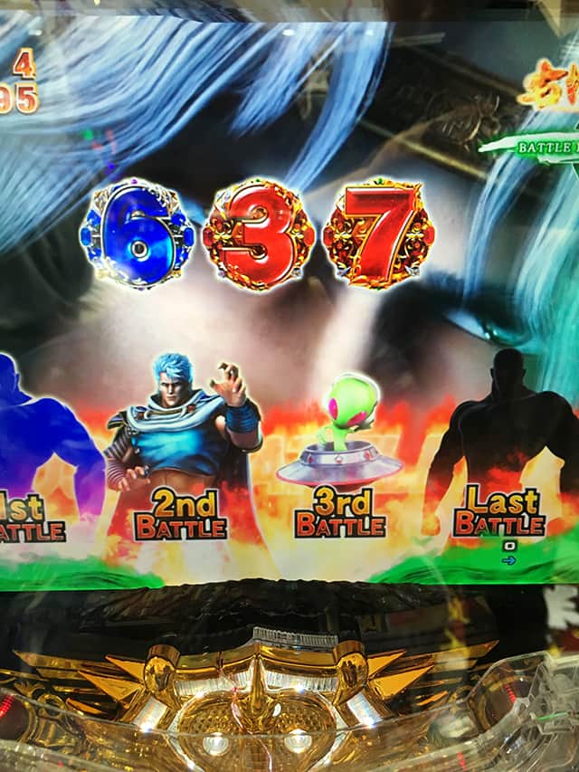 確変「バトルラッシュ」です。今までの北斗シリーズだと1回勝負で決着をつけていましたが、今回は毎回異なるキャラと最大4回戦って、内1回でも勝てばその時点で大当りとなります。んで、肝心の対戦相手なんですけど、それを示唆しているのが液晶下にあるバトルアイコン。写真の場合だと、1戦目と2戦目がユダ、3戦目がラオウ、4戦目がランダムだよ、という示唆になっています。