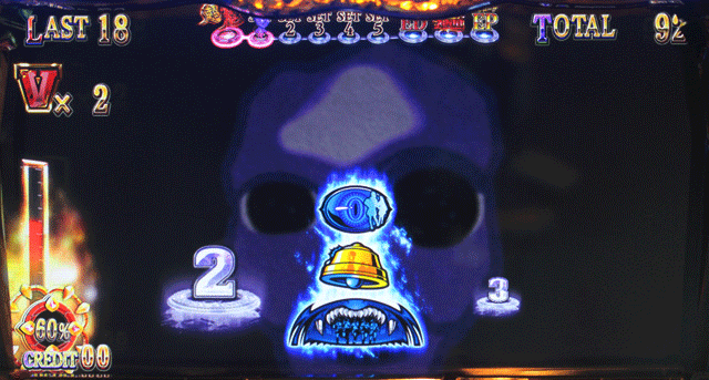 通常時にいきなり「中リールにシンボル(2連)絵柄を狙え!」という演出が発生する可能性がありますが、目押しに成功(枠内にシンボル停止)すると捕喰ポイントが大幅減算されます。失敗しても50%で減算されるみたいですが、2コマの余裕があるのでビシッと成功させておきましょう。ただそんなにひんぱんには出ない感じ。
