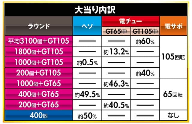 ※GTはGOLDEN TIMEの略。小当り経由時はV入賞が条件で、特図2に限る。またGT中は2or9or10R×複数回の合計を1回の大当りとして継続率を掲載。