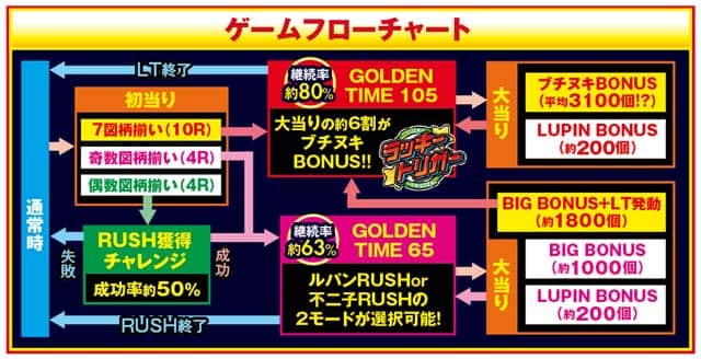多彩な演出でルパン一味が躍動する「ルパンRUSH」、全4モードで不二子が活躍する「不二子RUSH」いずれかを選択して大当り&継続を目指す。RUSHは前半1〜50回転、後半51〜65回転の2段階で展開される。