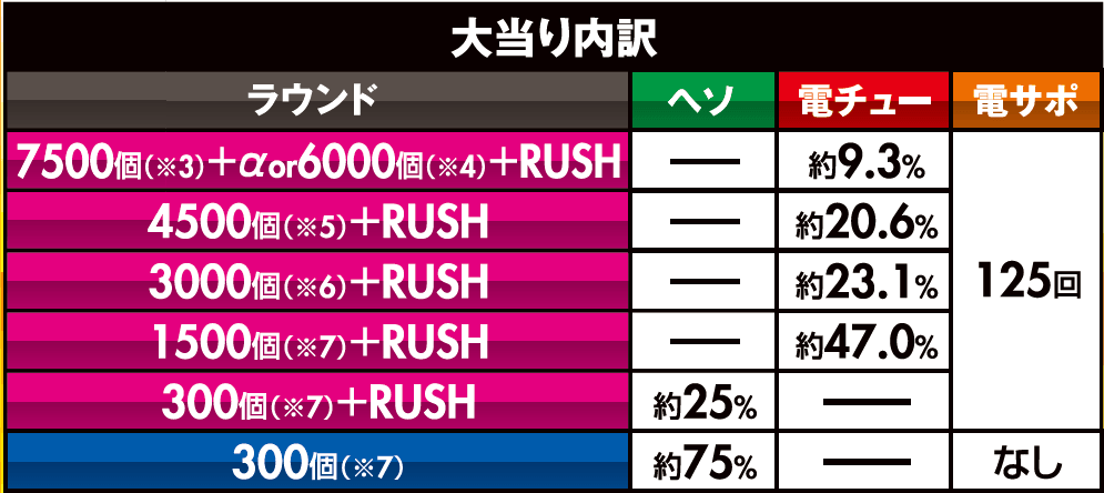 払い出し出玉 | 約7500個(※3) 約3000個(※6) 約1500個(※7) 約300個(※7) |