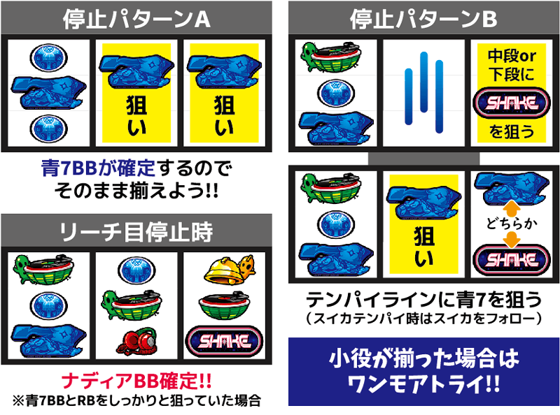 左リール下段に青7が停止した場合はRBorナディアBBの可能性が高まるが、小役入賞時とビタミス時は青7BBの可能性が残される(スベリコマ数確認で精度アップ)。