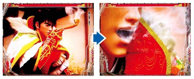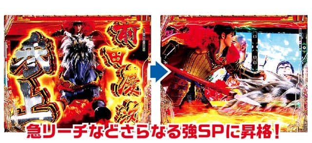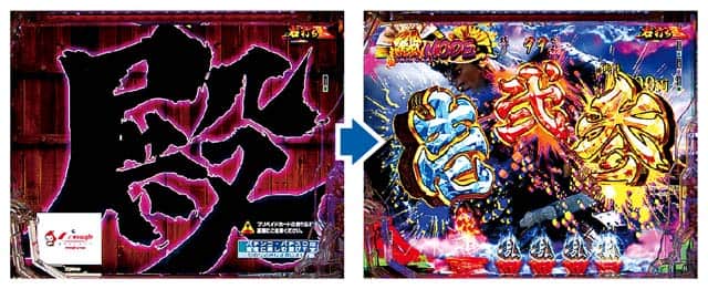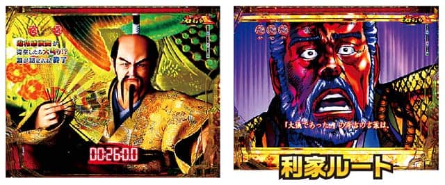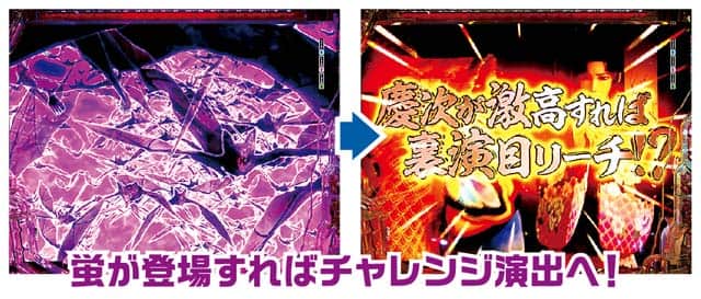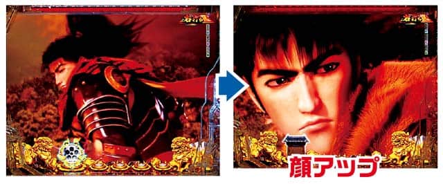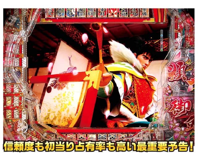 おなじみの先バレ告知は「白」と「赤」の2通りが設定可能だ。また新たな注目はレバ熱告知カスタムで、ヘソ入賞時に法螺貝が鳴った後、「いざ参る!」の声が聞こえると成功! 「赤」設定時なら約54%が大当りにつながる。