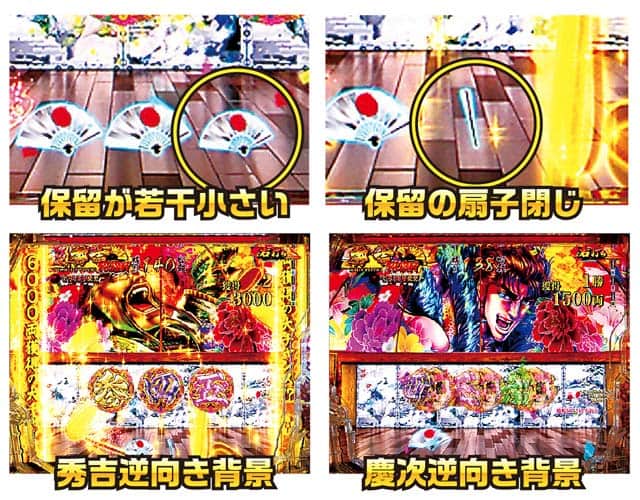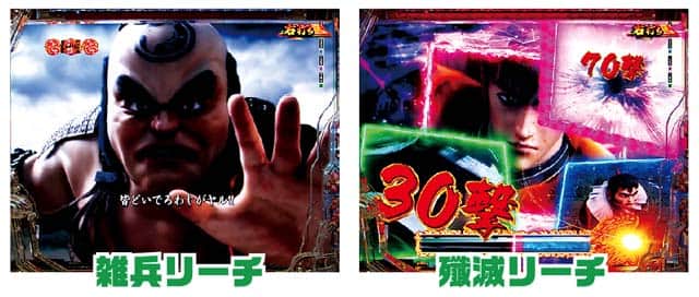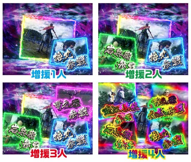 主な演出は雑兵リーチと殲滅リーチがあり、前者は慶次登場、後者は増援の人数が4人なら大チャンスだ。