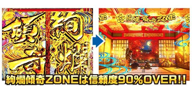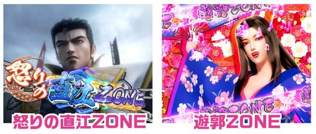 怒りの直江ZONEは涙響背景、遊郭ZONEは笑福背景で発生するチャンスゾーン。絢爛傾奇ZONEはSPリーチに加え、信頼度も激アップする灼熱ゾーンだ。