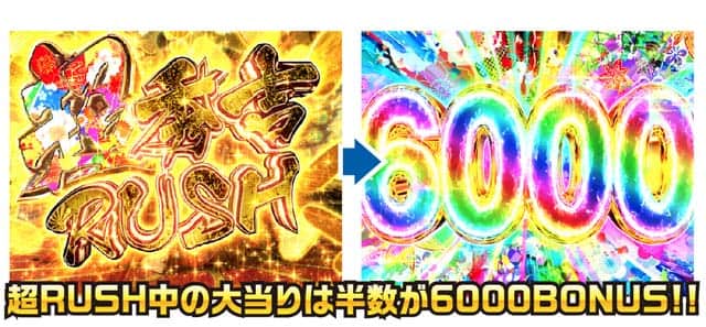 RUSHも超RUSHもST回数は143回転で、この間の引き戻し率はどちらも約77%。最大の違いはRUSH中の大当りは約半数が3000BONUSで、超RUSH中の大当り時は約半数が6000BONUSという点だ。