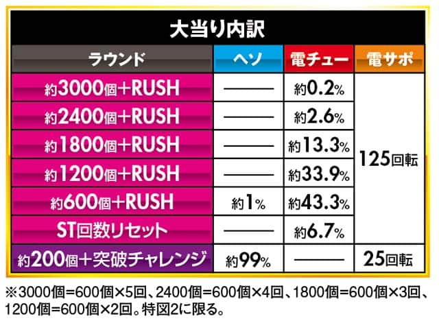 ※1 c時短当選を含む時短25回転突破率。特図2に限る。※2 c時短当選を含む時短125回転継続率。特図2に限る。 ※3 普図抽選回数。