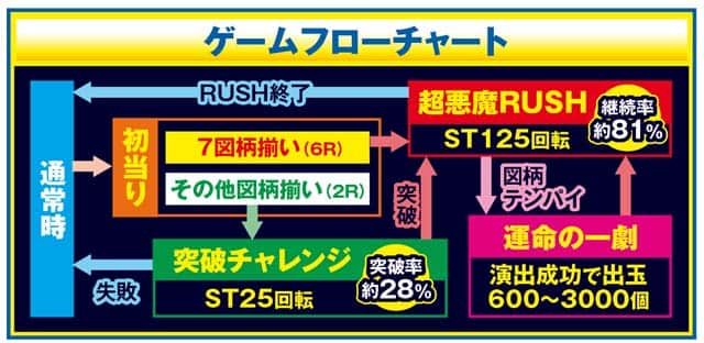 大当り確率 (RUSH時運命の一劇発生率) | 約99.9分の1 (約66分の1) |