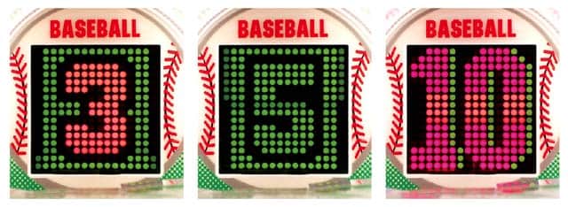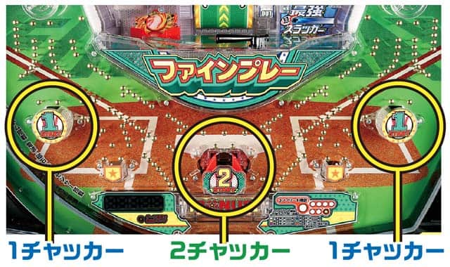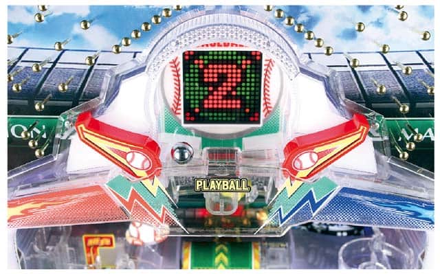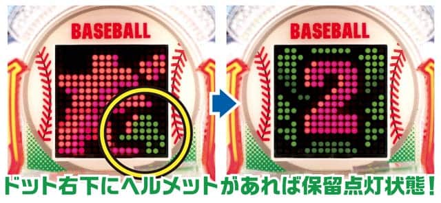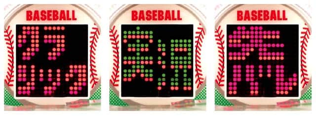 チャッカー入賞の段階で、その羽根開放で当たった際のラウンド数を告知。ドットに表示されるバットの色や、LEDランプの出塁状況に注目しよう。