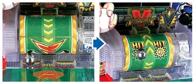 左右の溝に貯留した玉が「HIT」についた場合は、ローラー上部の「V」の位置次第で大当りの可能性がある。
