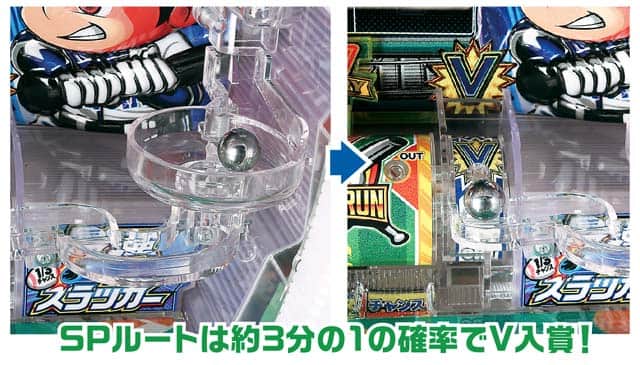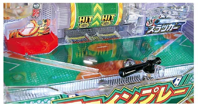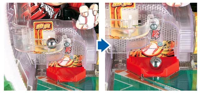役モノ左側に流れた玉は「勝負」と書かれた可動体に登場。ここで玉が左側に逸れてしまうとハズレだが、赤色の板の上に落ちれば投球開始!