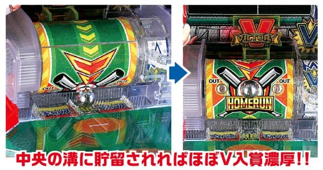 ローラー式回転体の下段中央の溝に玉が貯留されると、「HOMERUN」と書かれた磁石にくっついて超高確率でV入賞!