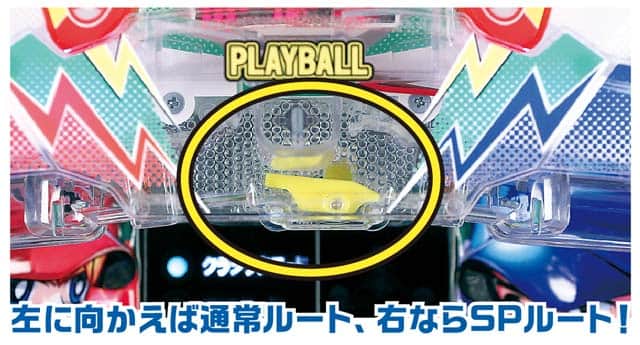 役モノ内に入った玉はまずは黄色のシーソー役モノの上へ。基本は左側のメインルートに向かうが、タイミング良く右に流れた玉はSPルートへ!