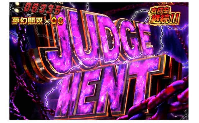 タッグバトル勝利後は無双ジャッジメントで獲得出玉(1500~7500個)が告知される。演出は4種類あり、ドックン煽りだと大出玉獲得のチャンス、絞り演出なら大チャンスだ。