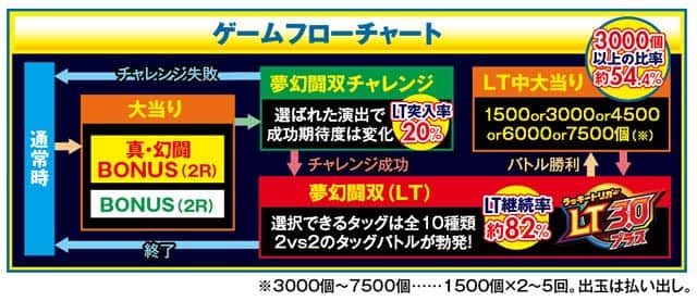 継続率約82%×最大出玉7500個(10R×5回)を誇るLTモード。この間は2vs2のタッグバトルに勝利できれば大当り+継続濃厚だ。