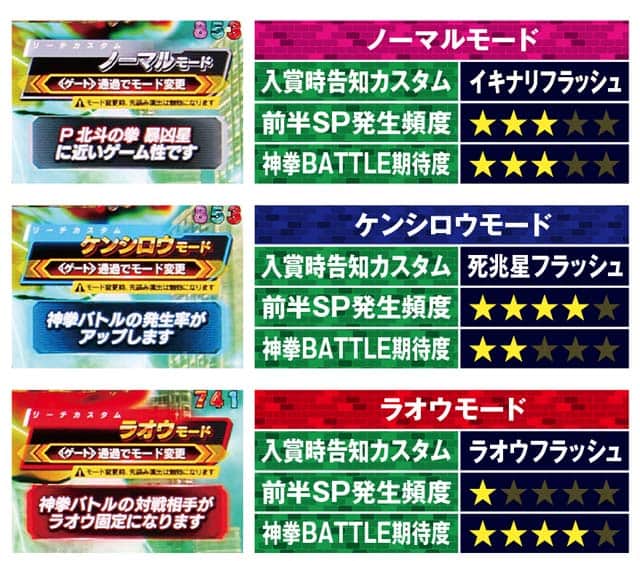 盤面右のゲートに玉を1発通すと、本機のメインリーチである神拳BATTLEの発生率と信頼度が変更可能だ。よりバトルを楽しみたい人はケンシロウモード、逆にアツいバトルを味わいたい人にはラオウモードがオススメだ。