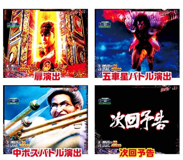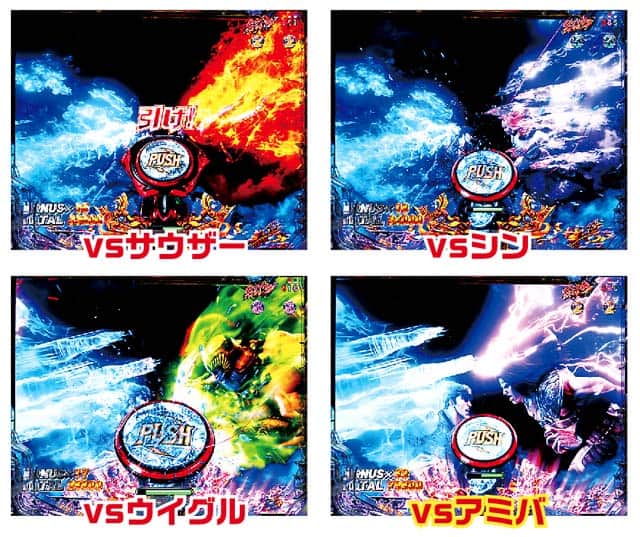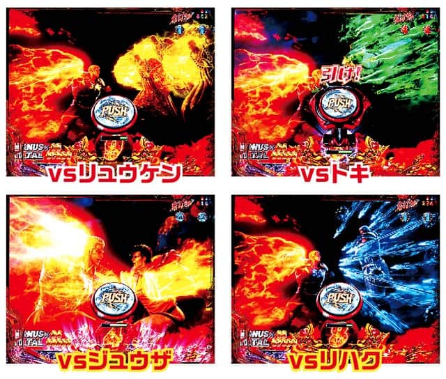 残保留4個はバトルで決着が付く。拳王RUSH選択時は前作同様、リュウケンが相手だと大ピンチだが、トキやジュウザなら大チャンスだ。救世主RUSHはサウザー→シン→ウイグル→ジャギの順に勝利期待度がアップする。