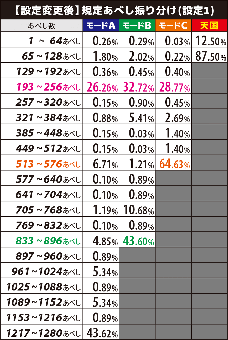 設定変更後は専用のテーブルで規定あべし振り分けの抽選が行われ、モードAの最大天井も1280あべしに短縮される。
