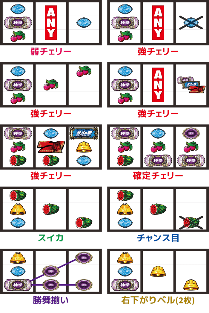チェリーは弱·強·確定の3種類があり、通常時の強チェリーは主に天破に期待(AT直撃もアリ)。