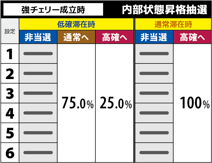 通常AT中は弱チェリー成立時の一部で中押しチャンスが発生することにより、強チェリー確率が99.4分の1まで上昇する。