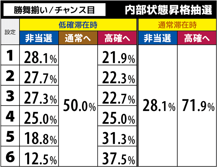 モード移行抽選はAT終了時と設定変更後の有利区間移行時に行われ、高設定ほどモードB以上へ移行しやすくなっている(設定1以外の値は調査中)。