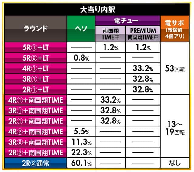 ※2 継続率は特図2残保留による引き戻しを含む。(PREMIUM)南国翔TIME終了後の残保留で2~4R大当りを引いた場合は南国翔TIME2本場(ST13回)に突入。