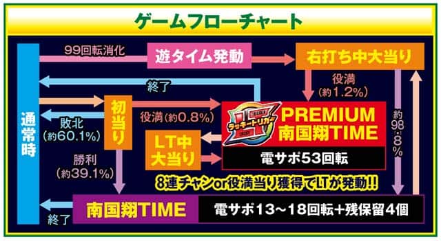 本機種のメインRUSHで、8連荘(初当り込み8回継続)するか、役満当りを引くことでLT「PREMIUM南国翔TIME」に突入する。