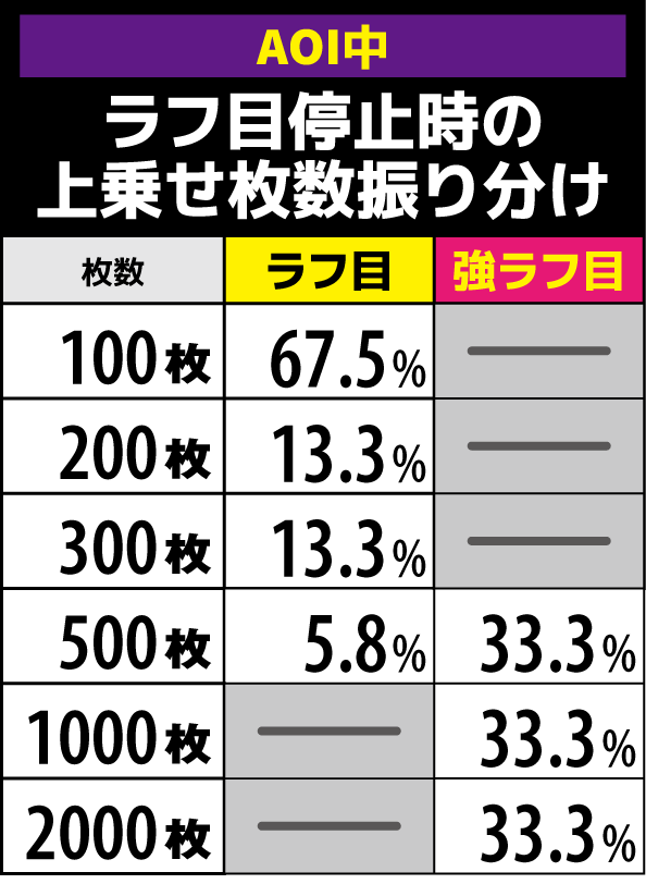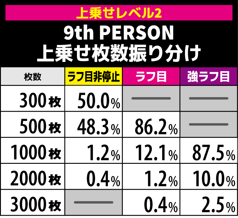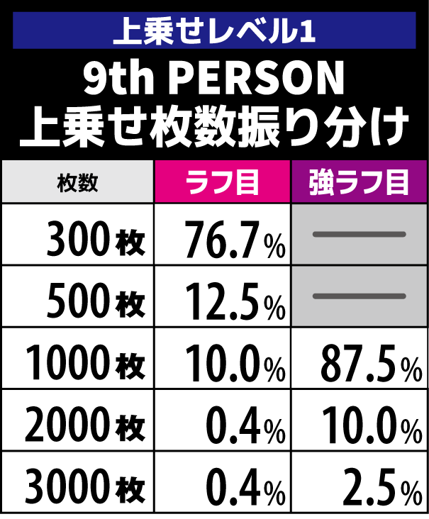 上乗せレベル1は9th PERSON成功で300枚以上を上乗せする。強ラフ目は1000or2000or3000枚の上乗せとなるためかなりアツい。