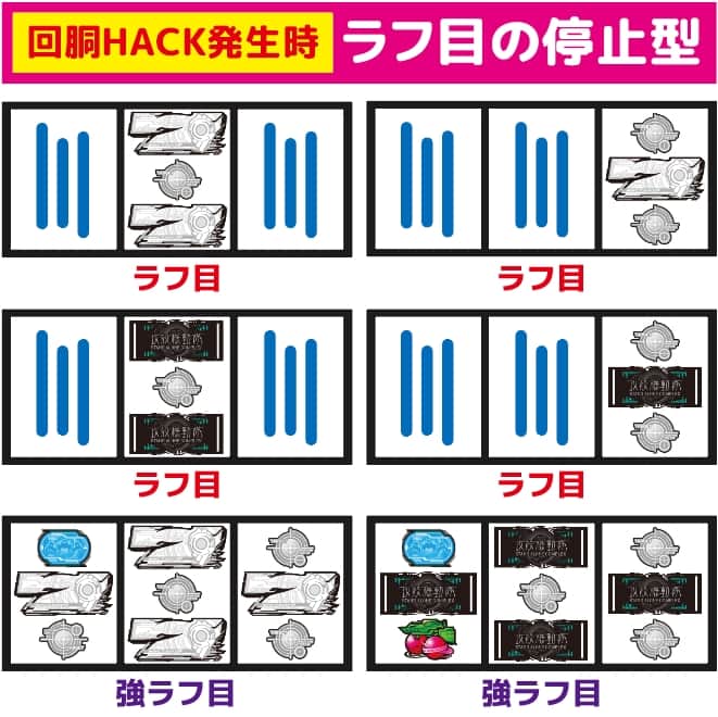 回胴HACK発生ゲームでは合算2.3分の1の押し順ベルB以外を引けば(強)ラフ目が停止。