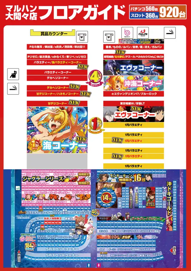 | 稼働台数 | パチンコ560台 / パチスロ360台 |