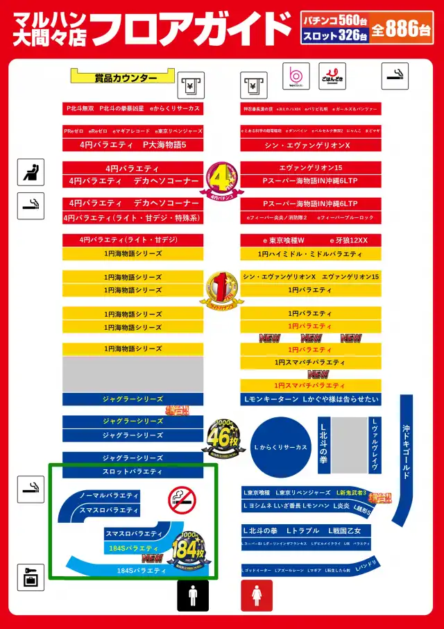 | 稼働台数 | パチンコ560台 / パチスロ326台 |