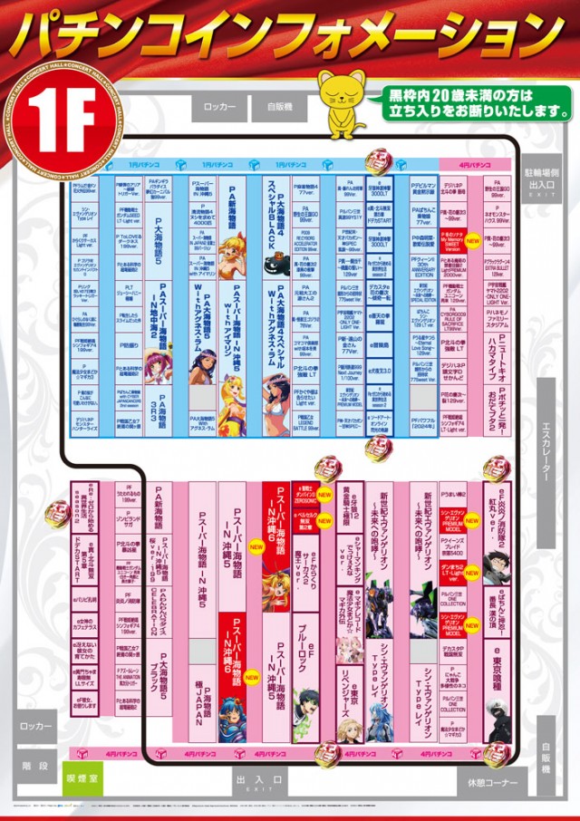 4円パチンコ135台、1円パチンコ98台、20円スロット164台のお店