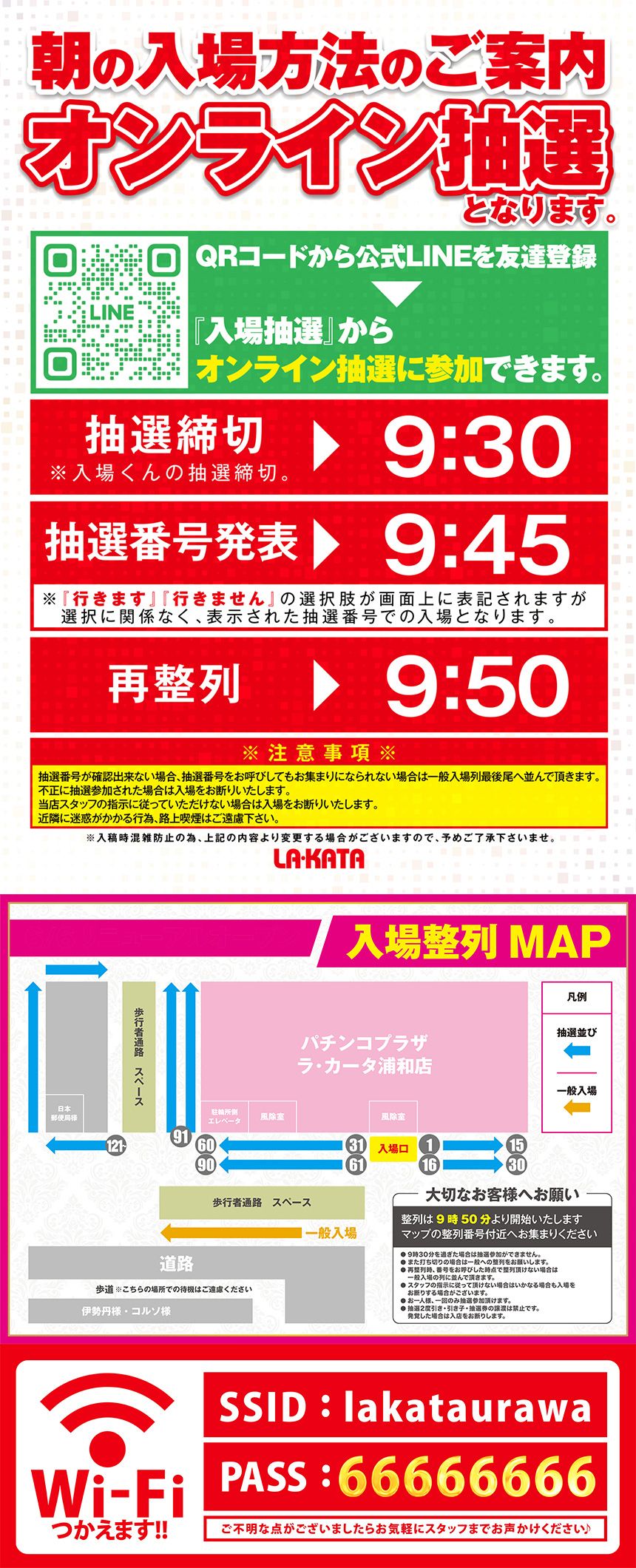 | 入場ルール | 通常(9:30入場くん抽選締切),検査日(14:30入場くん抽選締切) |