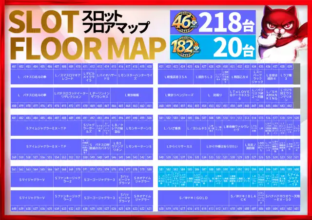 | 稼働台数 | パチンコ399台 / パチスロ238台 |