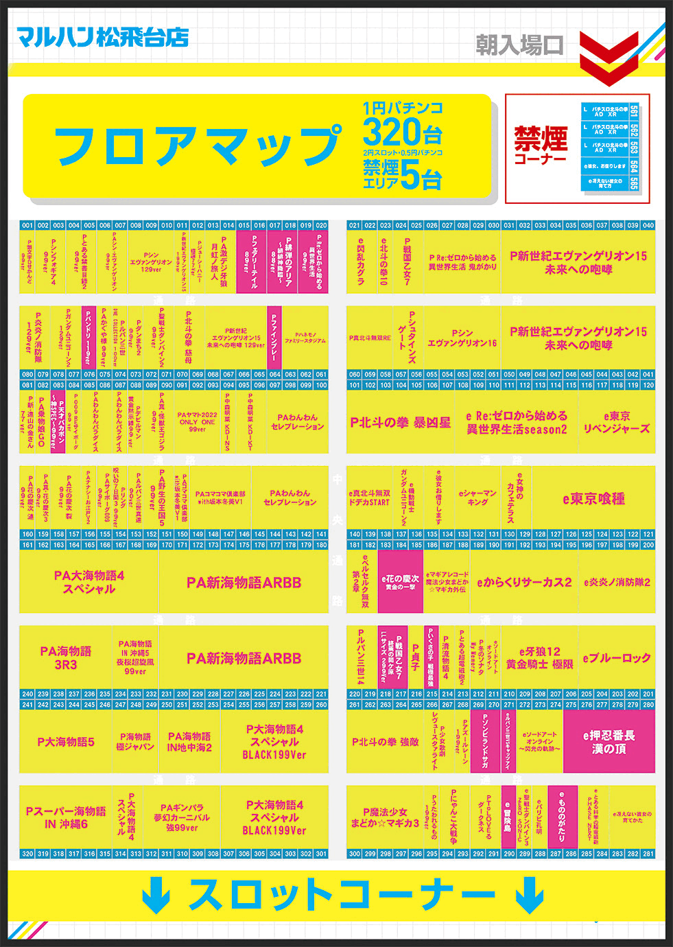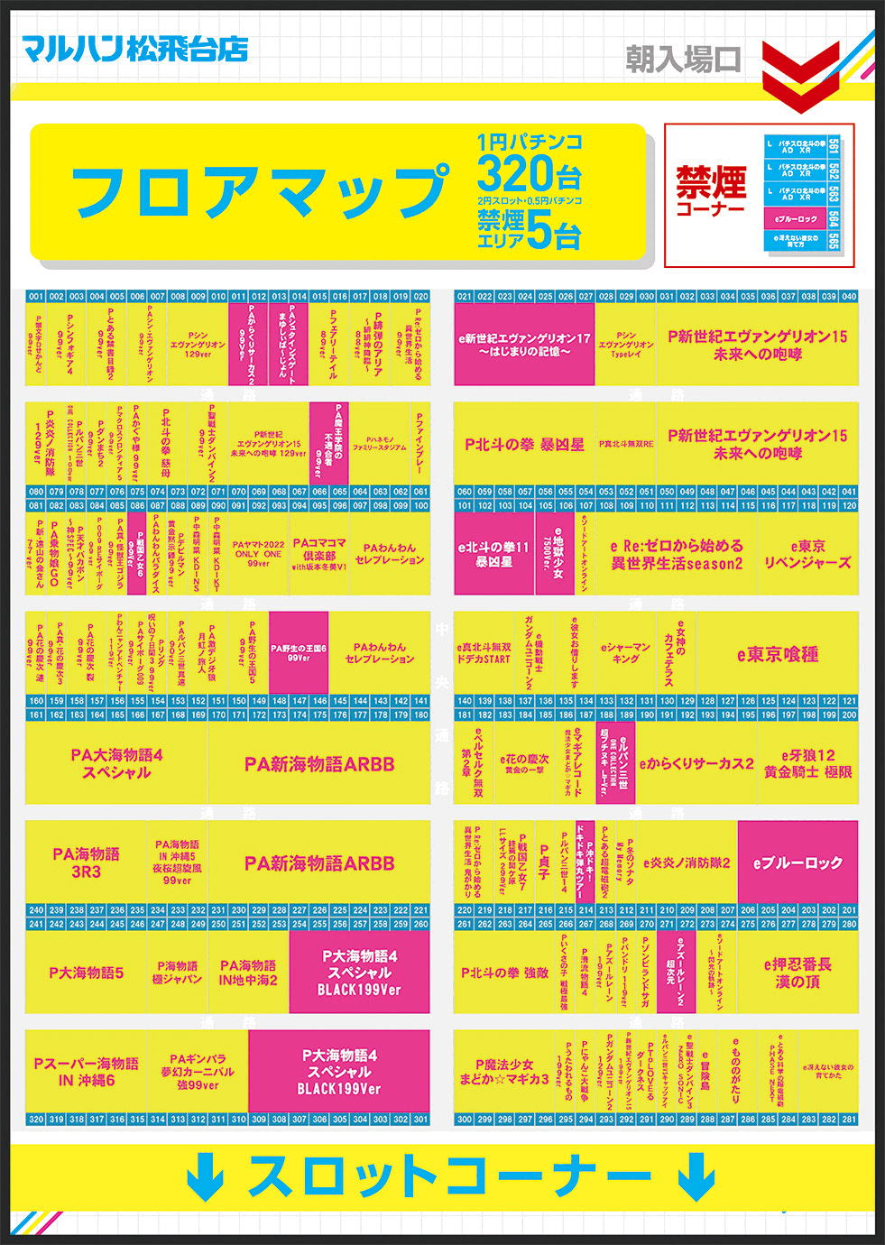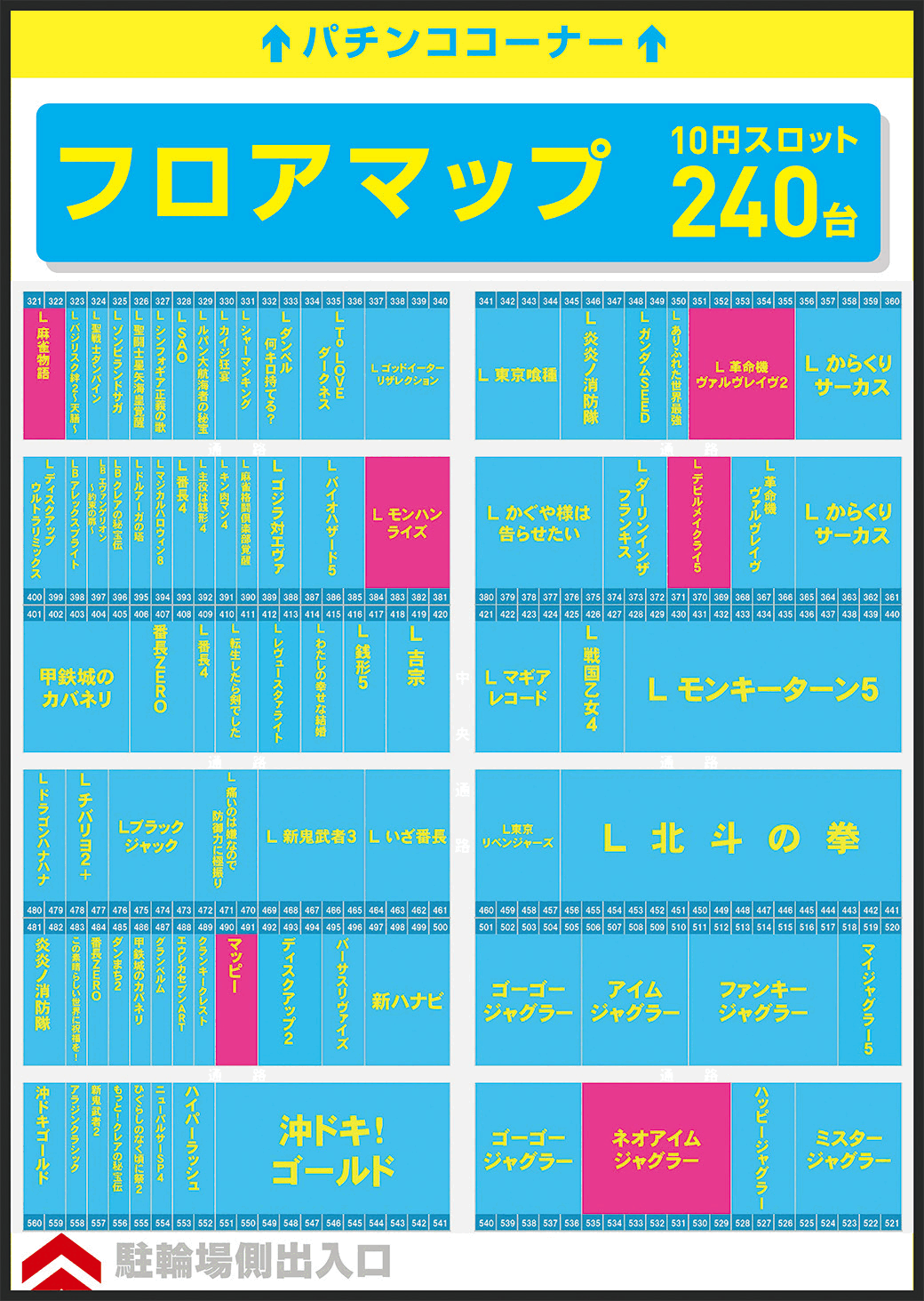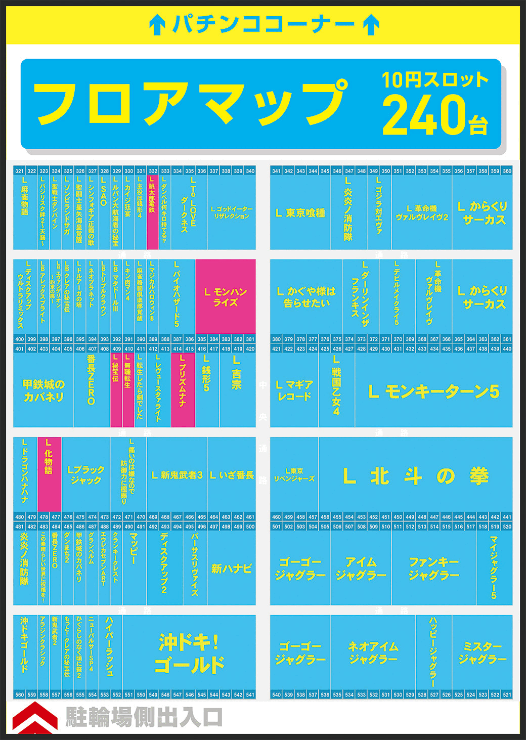 | 稼働台数 | パチンコ322台 / パチスロ243台 |