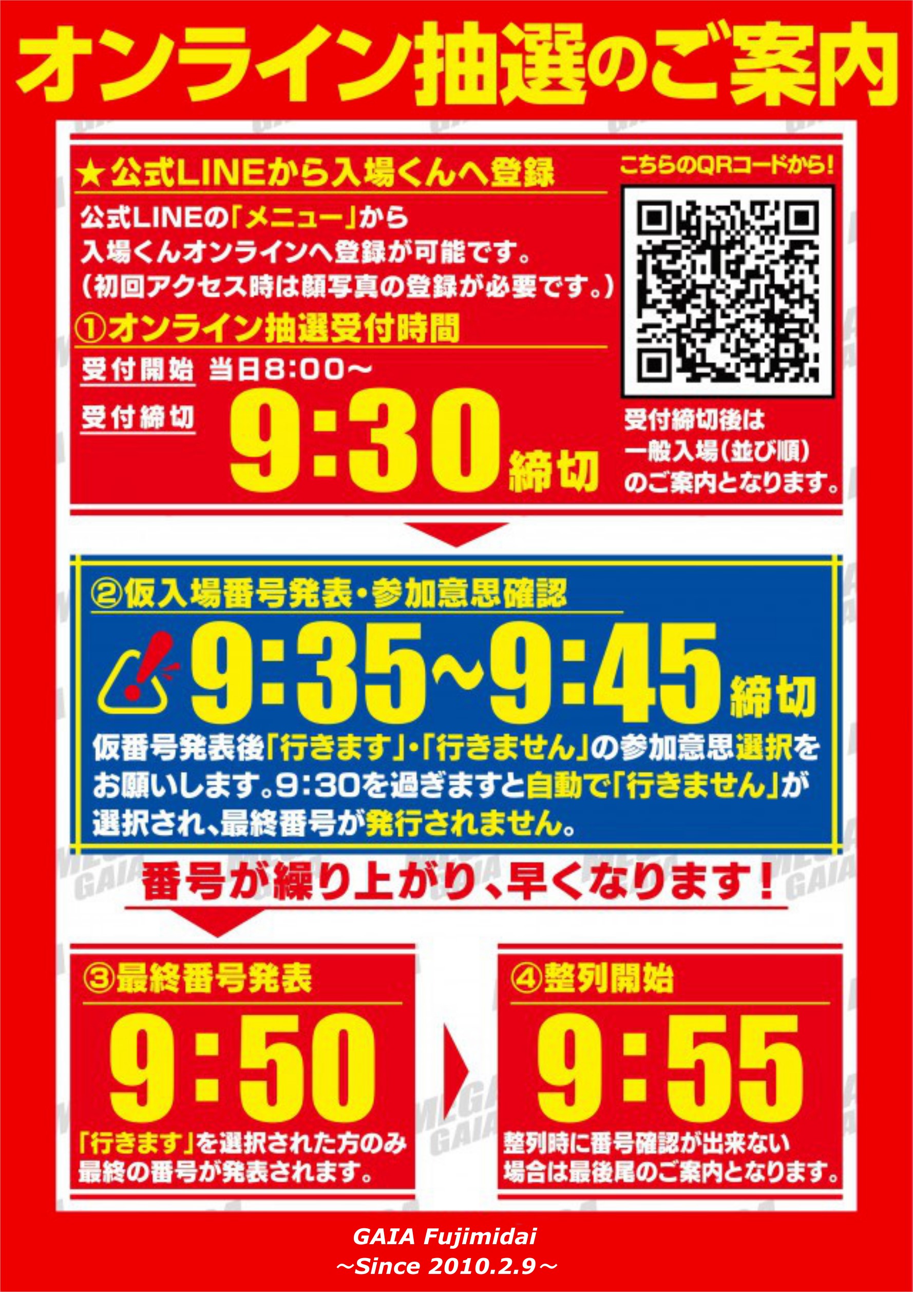 | 入場ルール | オンライン抽選(入場くんインフィニティ) |
