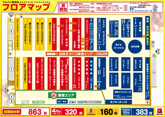 | 稼働台数 | パチンコ480台 / パチスロ382台 |