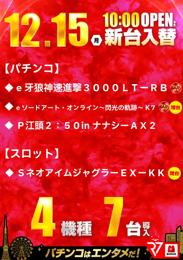 | 稼働台数 | パチンコ561台 / パチスロ664台 |