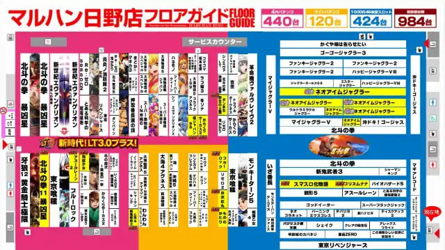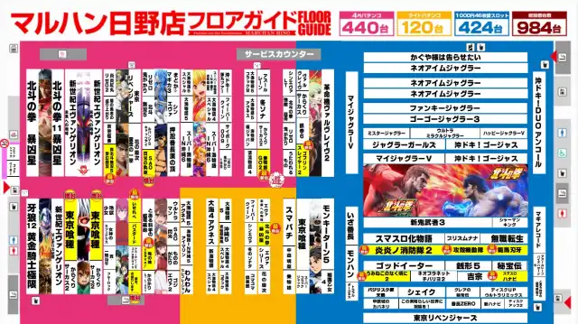 | 稼働台数 | パチンコ560台 / パチスロ424台 |