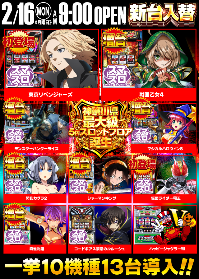 | 営業時間 | 09:00 ~ 22:50(定休日:年中無休) ※通常遊技は22:40までとなり、会員カードをお持ちのお客様は22:50まで延長遊技が可能となります。 (延長遊技のお客様は当日の交換は出来かねますので予めご了承下さい) |