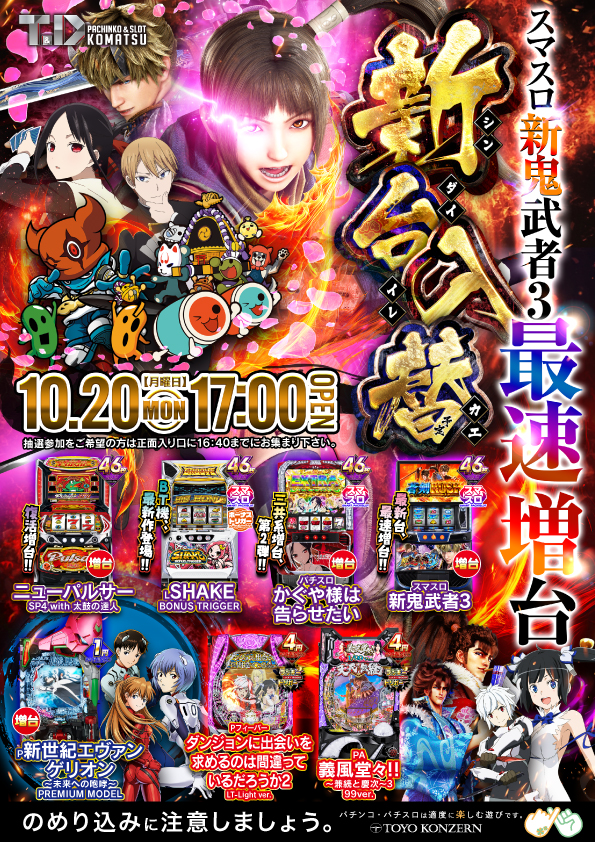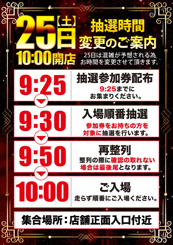 | 営業時間 | 10:00 ~ 22:45 入場整理券の配布について 【通常】AM9:00~ 【新台入替】PM17:00~ 店舗正面入り口にて配布致します! |