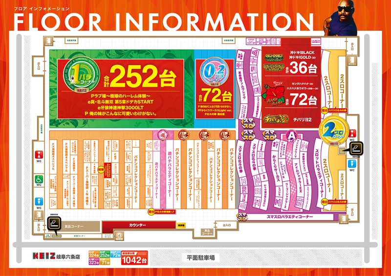 | 稼働台数 | パチンコ648台 / パチスロ394台 |