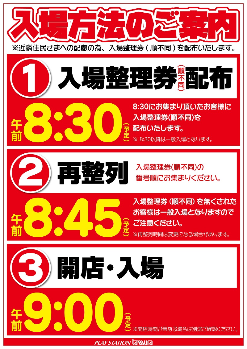 | 入場ルール | 抽選(8:30) |