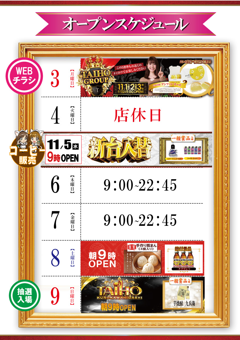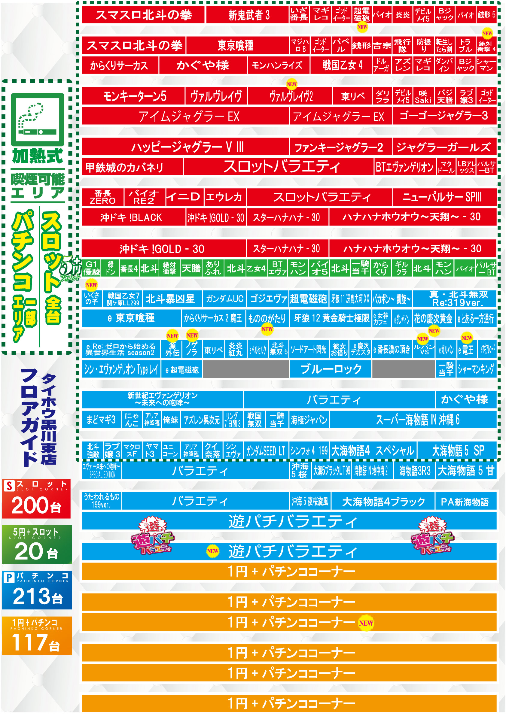 | 営業時間 | 09:00 ~ 22:45(定休日:年中無休(但し、新台入替前日はお休みを頂く場合がございます。)) |