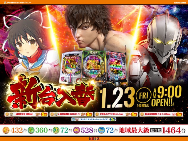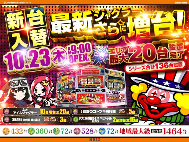 | 営業時間 | 09:00 ~ 22:45(定休日:年中無休(新台入替前日はお休みとなります)) |
