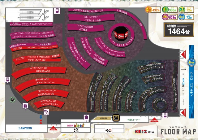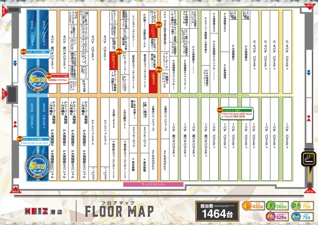 | 稼働台数 | パチンコ864台 / パチスロ600台 |