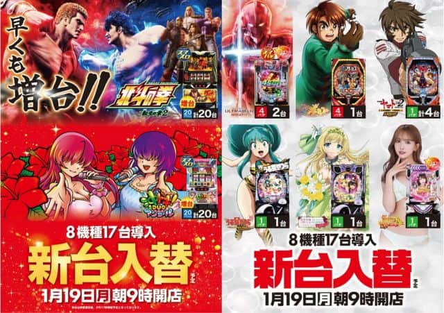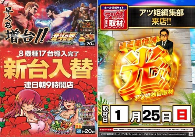 | 営業時間 | 09:00 ~ 23:00(定休日:なし ※設備刷新等により店休日を頂く可能性もございます。予めご了承くださいます様、宜しくお願いいたします。) 22:50 遊技終了となります。 |
