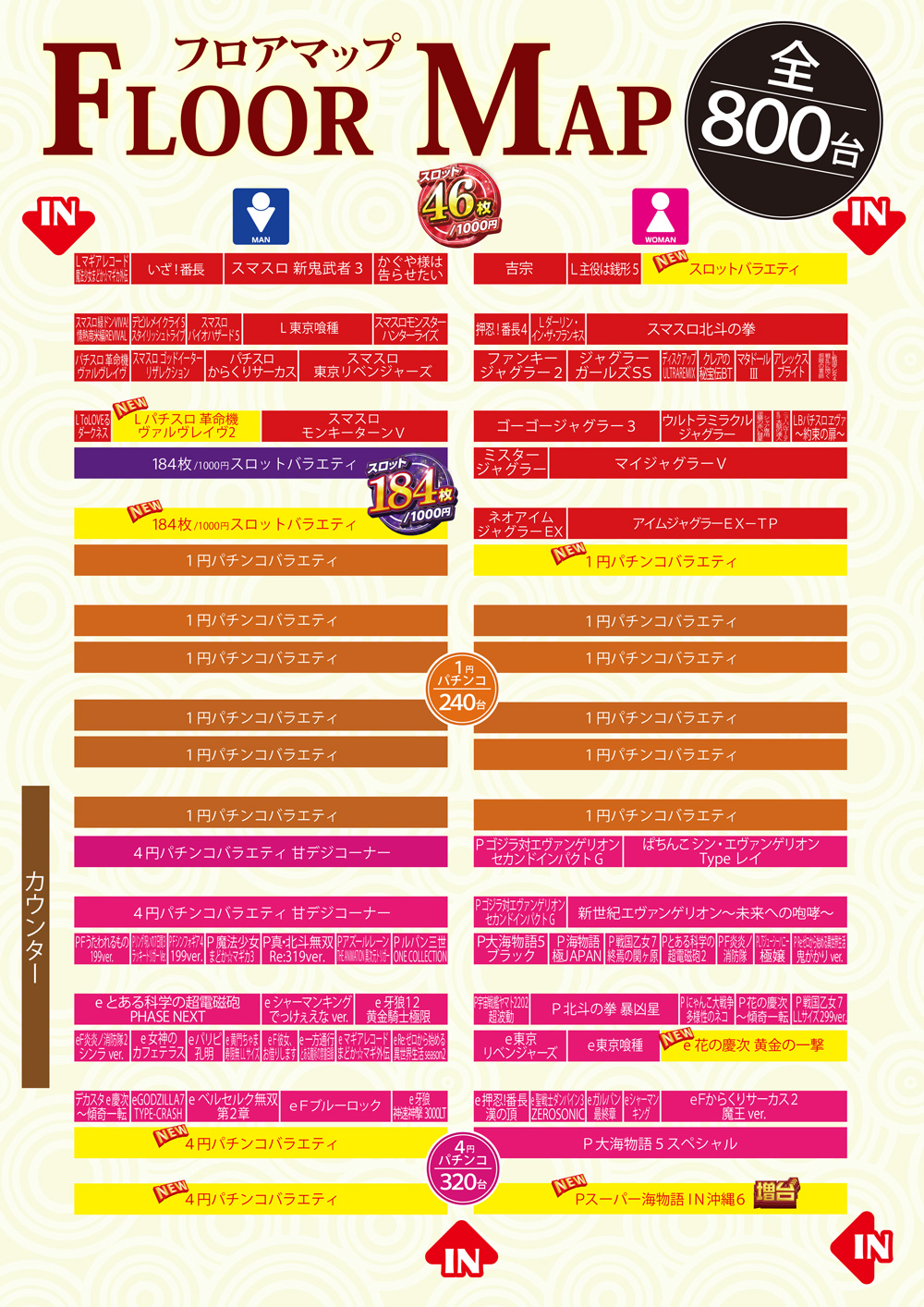 | 稼働台数 | パチンコ560台 / パチスロ240台 |