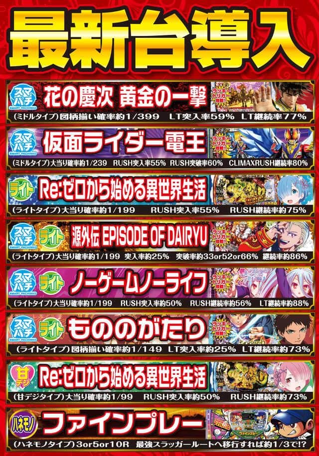 | 稼働台数 | パチンコ738台 / パチスロ636台 |